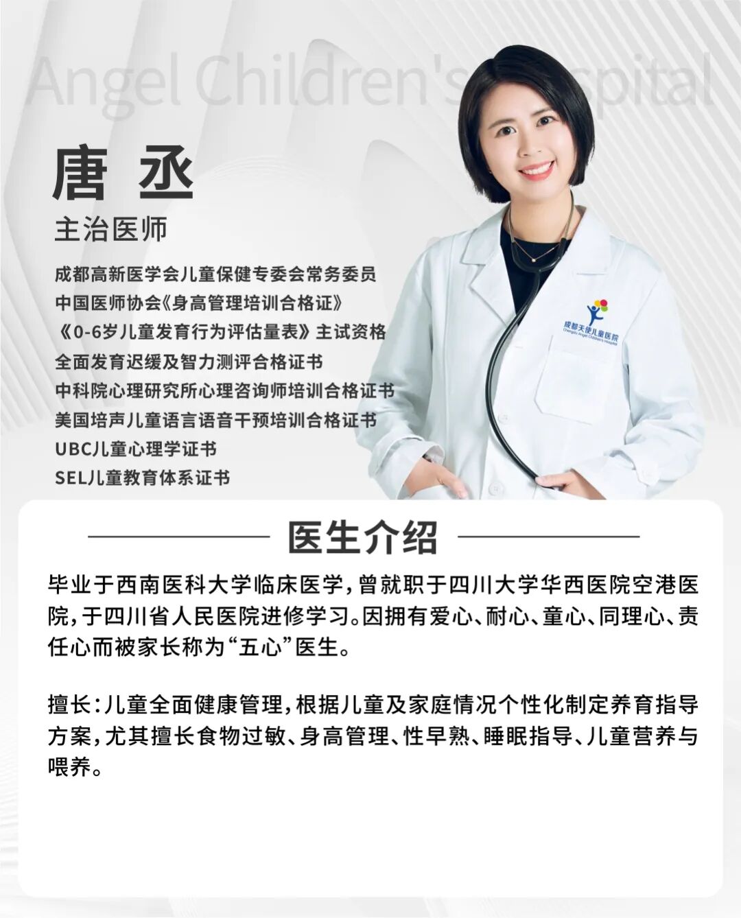 成都天使儿童医院是经成都市卫生行政管理部门批准的集医疗、保健、康复为一体的综合性儿童医院,惠及蓉城上万家庭,极大地缓解了广大儿童看病难问题。在成都天使儿童医院,我们不但有众多负责任、有能力的年轻医师...[详细]