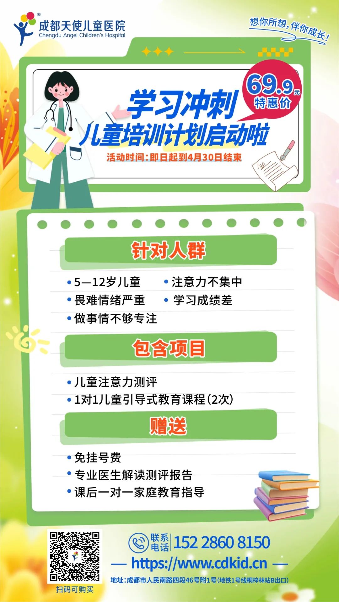 成都天使儿童医院儿童行为发育科深知专注力是孩子学习的金钥匙!针对5-12岁儿童注意力分散、畏难情绪、学习效率低等问题,我们特别推出「学习冲刺成长计划」,通过精准测评找到根源,用引导式课程培养学习能力,更配备家庭教育指导,...