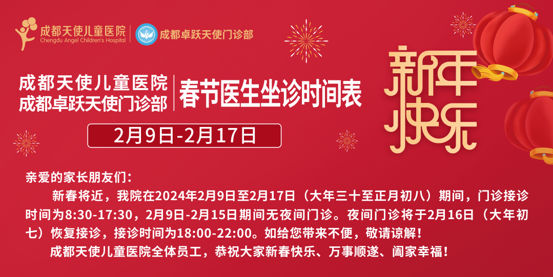 — Happy New Year —2024·甲辰龙年想你所想 伴你成长新年快乐亲爱的家长朋友们:新春将近,我院在2024年2月9日至2月17日(大年三十至正月初八)期间,门诊接诊时间为8:30-17:30,2月9日-2...