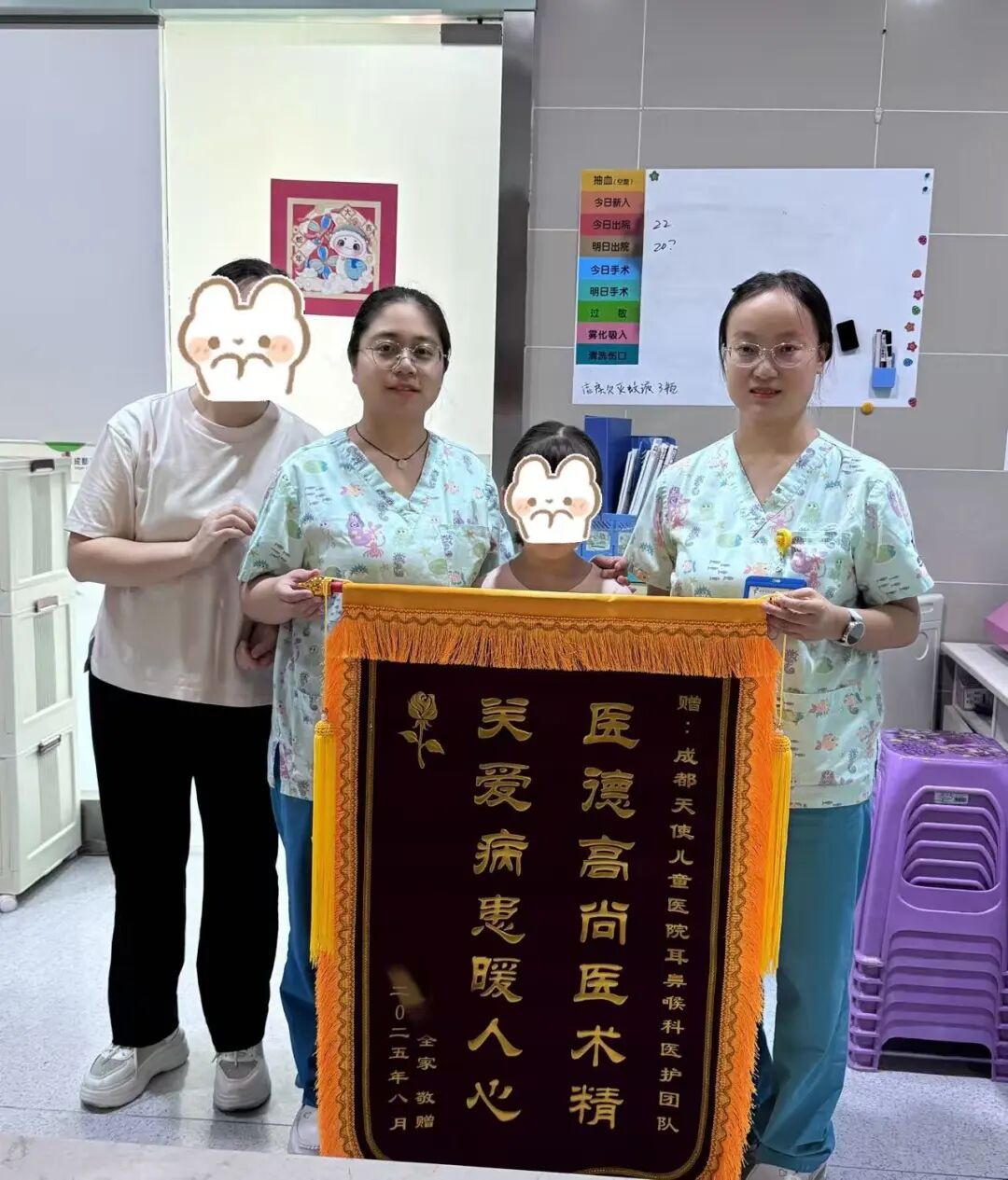 近日,成都天使儿童医院耳鼻咽喉科迎来了一份特别的荣誉。一位家长专程来到医院,为徐浪医生及护理团队分别送上两面锦旗,以表达对医护人员精湛医术和优质护理服务的充分肯定。据了解,这位家长7岁的孩子因腺样体肥大在我院接受了手术治...
