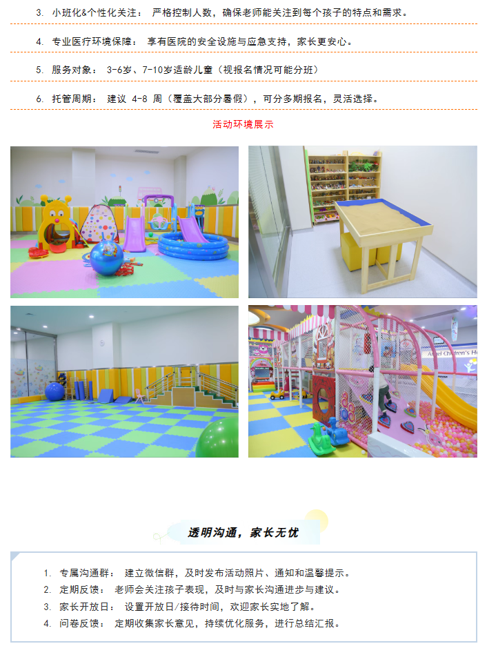 依托医院资源,关注孩子身心健康,提供安全、卫生的活动。