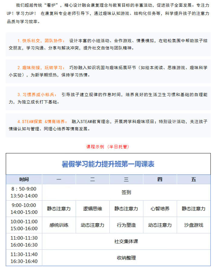 我们依托专业康复医疗背景,打造安全可靠、寓教于乐的成长空间,一站式解决您的看护难题,更助力孩子在注意力、学习力、社交力上全面提升,让这个暑假成为孩子快乐成长的加油站!